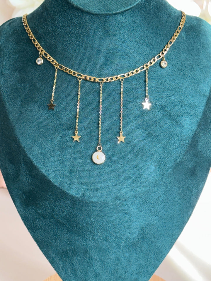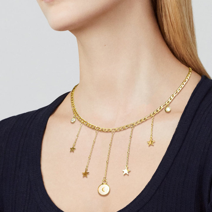 Chaque étoile, chaque détail doré raconte une histoire… mais la vôtre sera unique. Grâce à son pendentif en forme de lune, ce collier intègre une technologie invisible qui permet de conserver un souvenir personnalisé (vidéo, message vocal ou photo) que l’on peut retrouver à tout moment simplement en approchant son téléphone.
